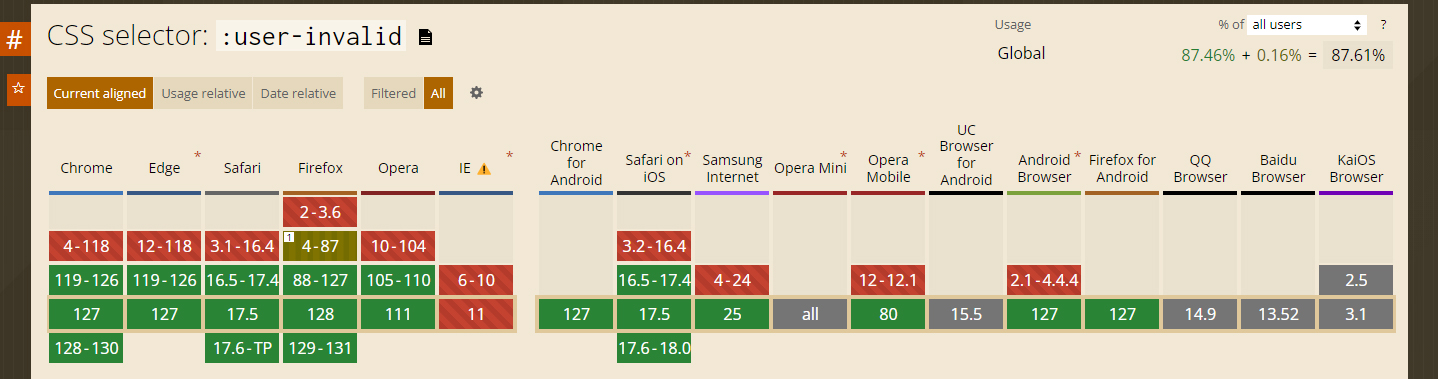 :user-invalidは CSS の擬似クラスで、ユーザーの操作の後、制約検証に基づき有効と判断されなかった検証済みのフォーム要素を表します。(引用::user-invalid (:-moz-ui-invalid) – CSS: カスケーディングスタイルシート | MDN)