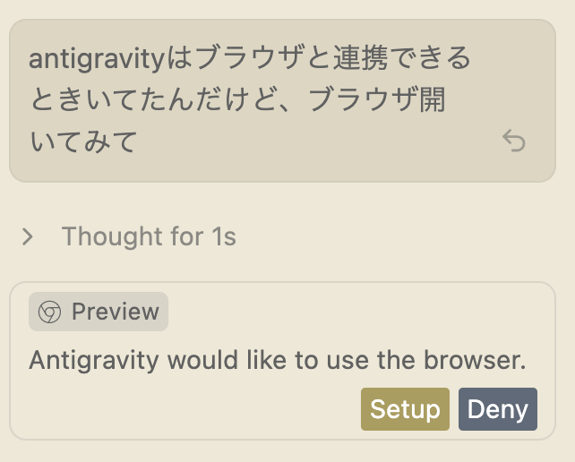特に、日常的におこなっている動作テストに関して、ブラウザとAI開発環境が対話しながらやってくれるのは、めっちゃ楽です。これはぜひどんなものか試してみたい、というわけで、Antigravityのチャットから、ブラウザを開いてみるように頼んでみました。