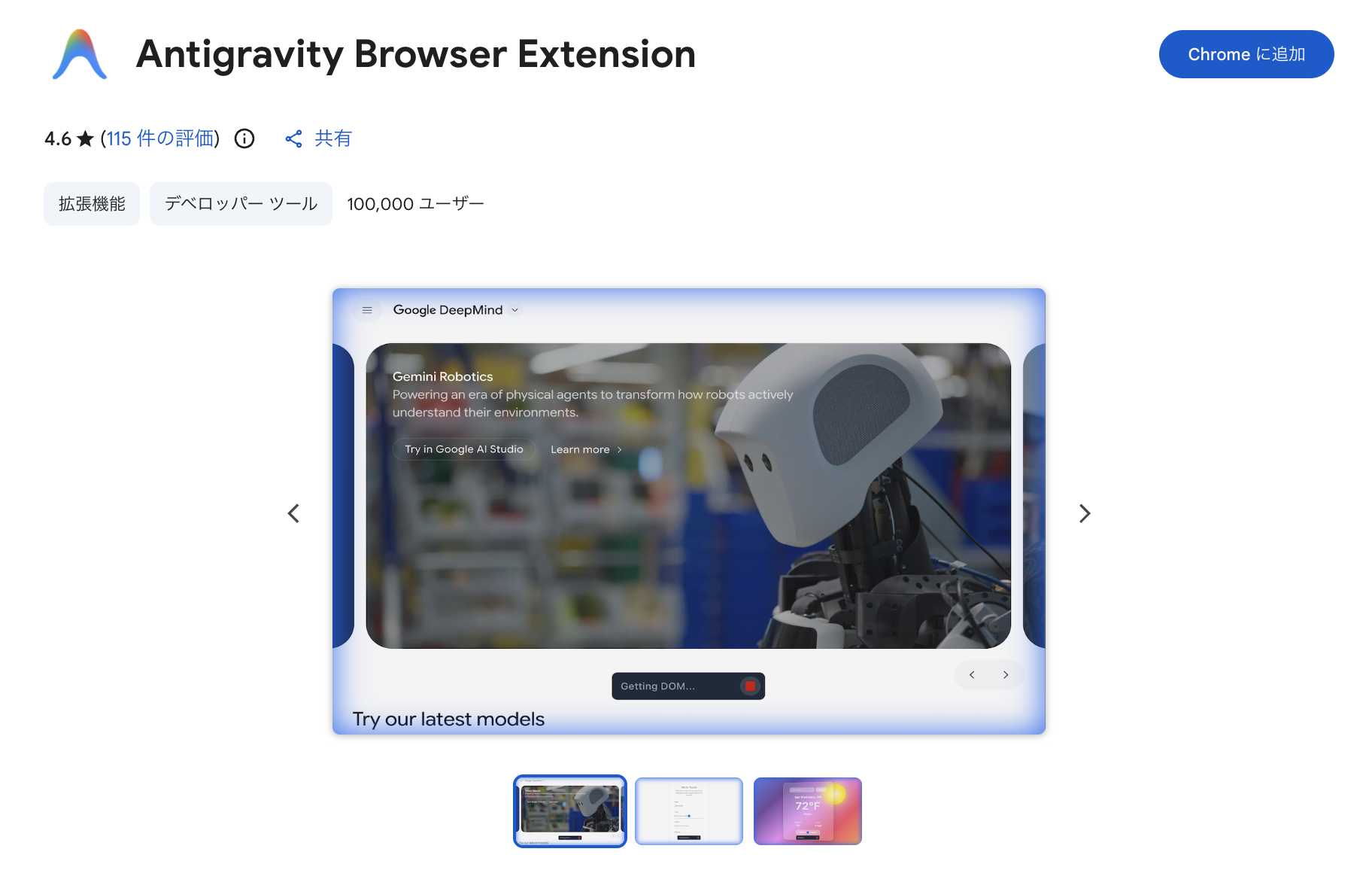 この「Antigravity Browser Extension」ってやつをChromeに追加する必要があるようです。「Chromeに追加」を押しましょう。