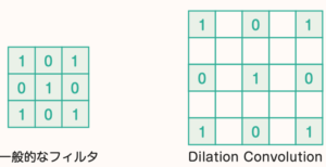 図1:(左)一般的な畳み込み層で用いられるフィルタの例 (右)Atrous Convolution に用いられる一定感アクで歯抜けを持つフィルタ