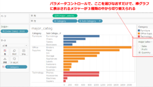 - 指標の切り替え(例:グラフに表示されるメジャーを売上 / 利益 / 数量の間で切り替える)