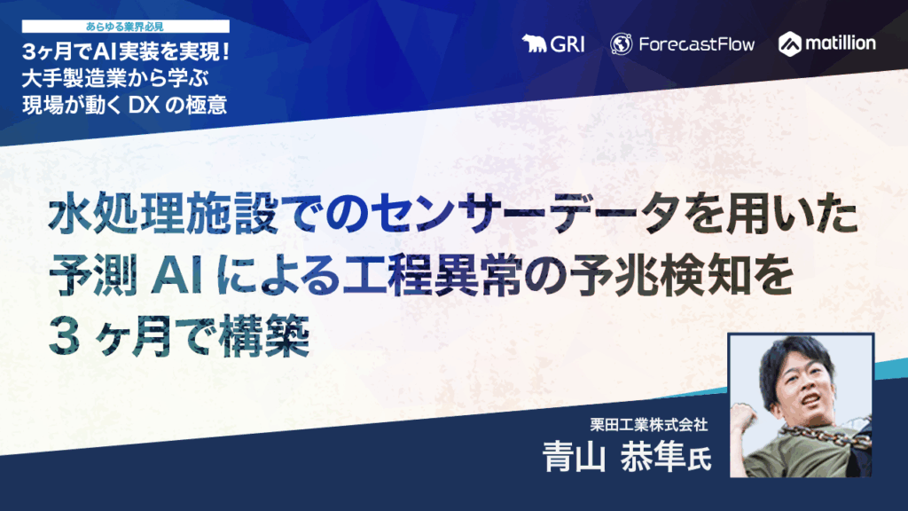 本イベントレポートでは、栗田工業株式会社の青山恭隼氏が発表された「水処理施設でのセンサーデータを用いた予測AIによる工程異常の予兆検知を3か月で構築」の事例をわかりやすくご紹介いたします。